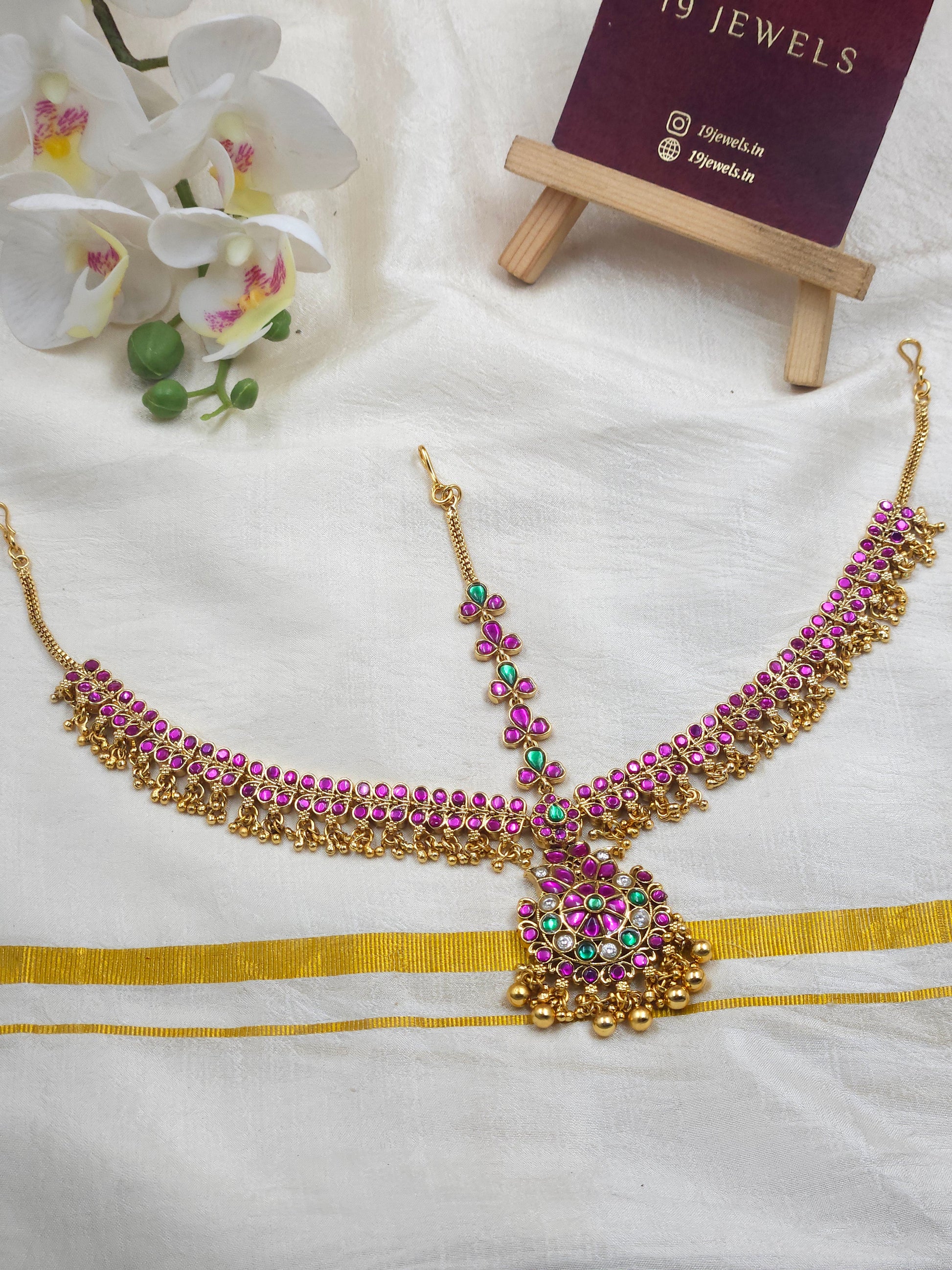 This three-sided mangtika features a damini design, representing eternal beauty. Its intricate design and durable materials make it a timeless accessory that will add elegance to any outfit. Dazzle with this expertly crafted piece, perfect for formal occasions or everyday wear.