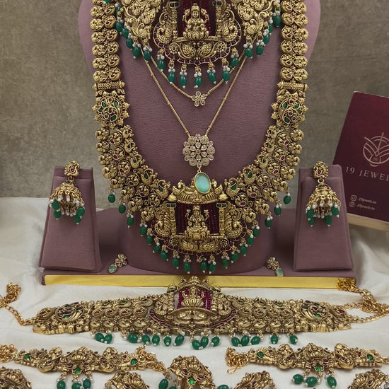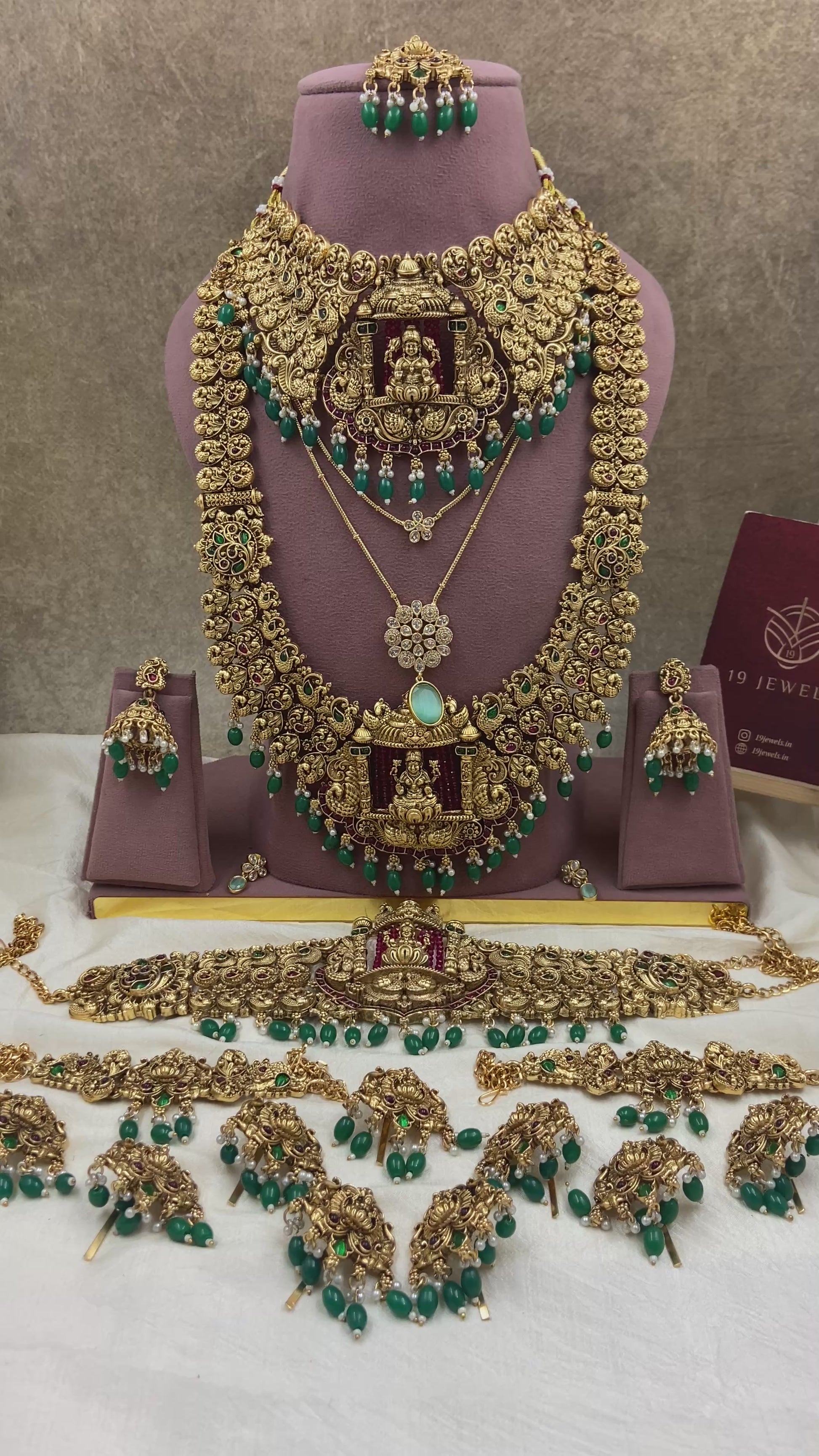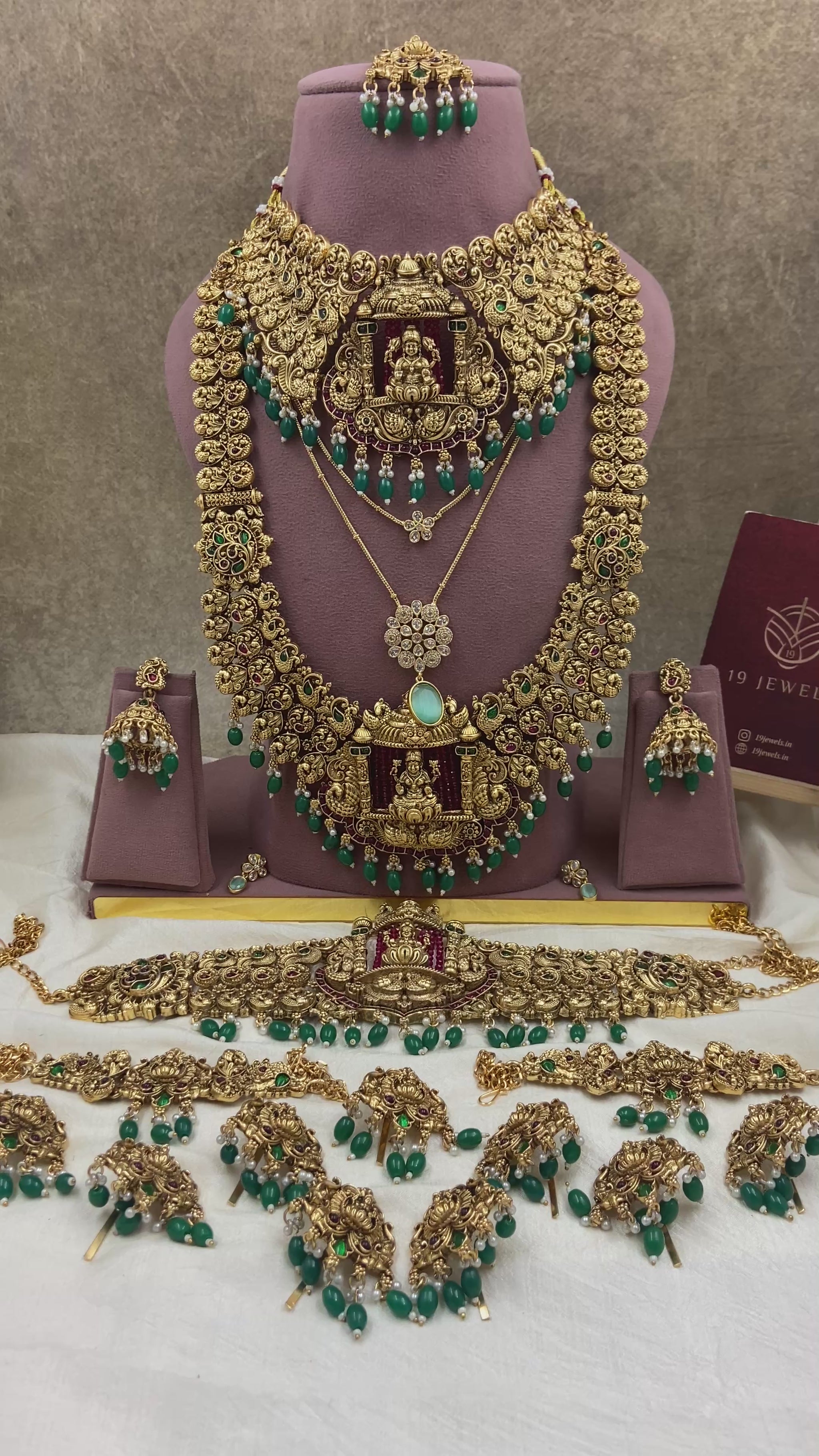 This elegant Grand full bridal jewellery set, model features a complete ensemble that will complement any formal or wedding attire. Made with the finest materials, this set includes a necklace, earrings and bracelet, providing a full and complete adornment option for the bride on her special day.