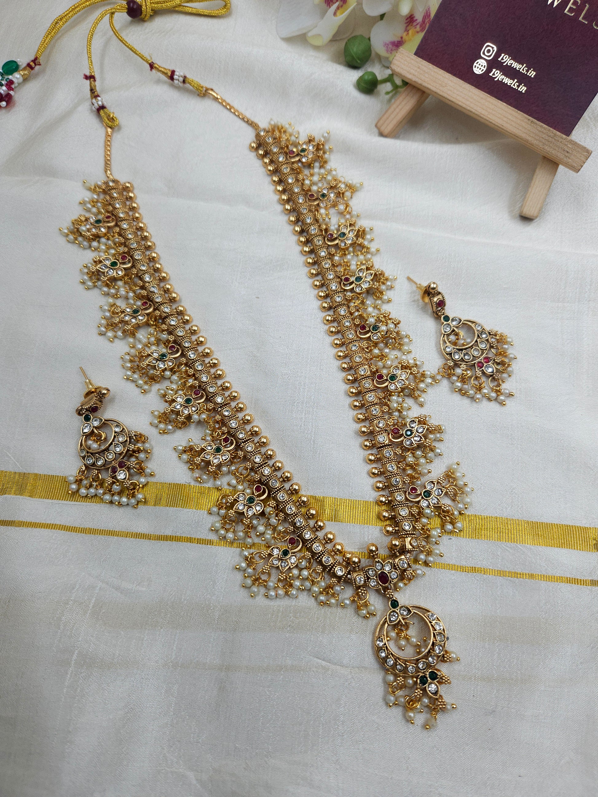 This Guttapusalu long haram is a stunning piece of jewelry featuring a traditional Gutapussalu haram design. Made with intricate craftsmanship, this necklace combines elegance and cultural heritage. Perfect for any occasion, it is sure to add a touch of beauty and sophistication to your wardrobe.