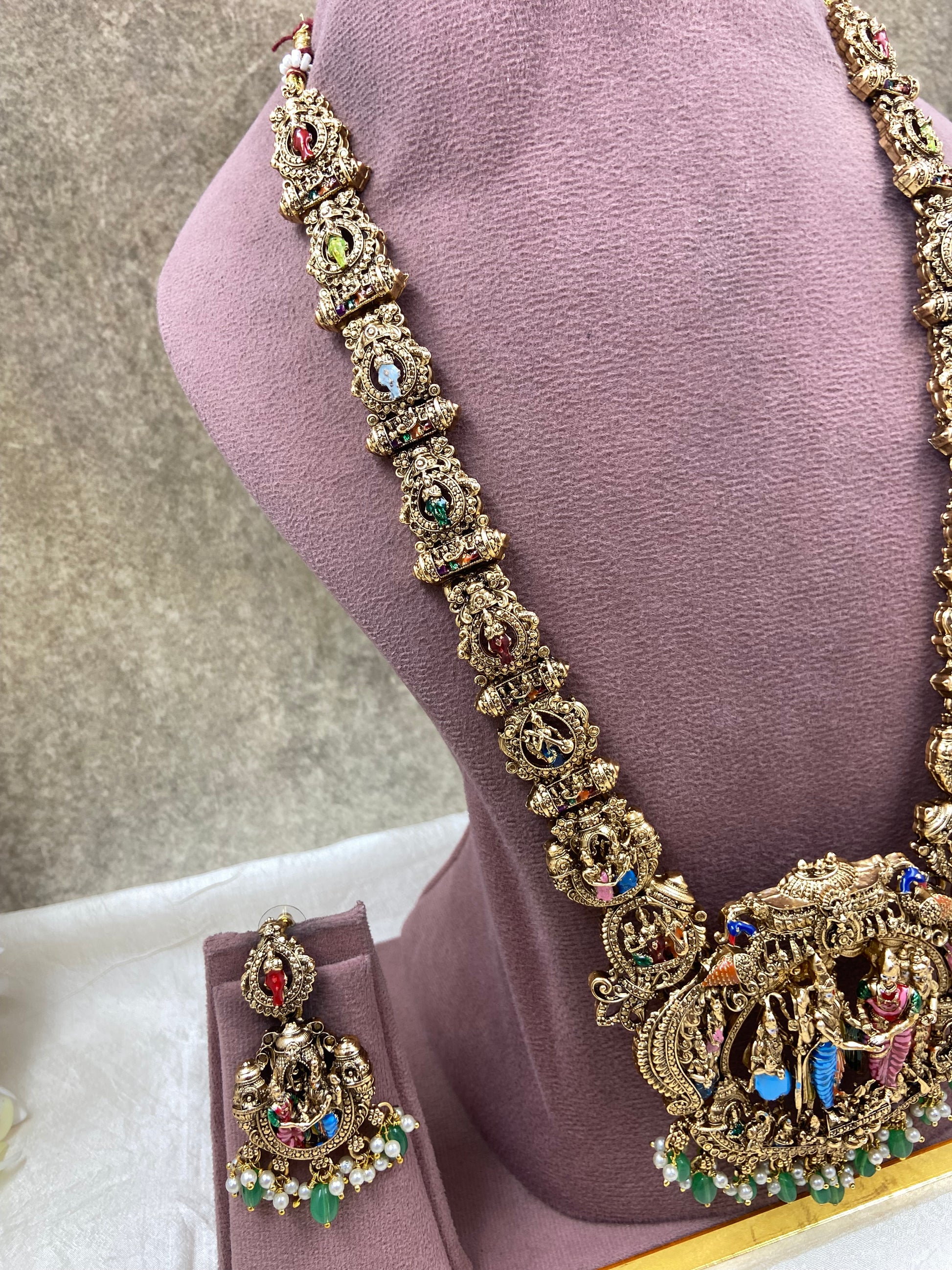 The Long Haram is a meticulously crafted necklace designed to enhance formal attire. Its elongated design offers an elegant drape, suitable for various occasions. With its sophisticated aesthetic, this piece serves as an excellent accessory to elevate your style and complement your wardrobe.