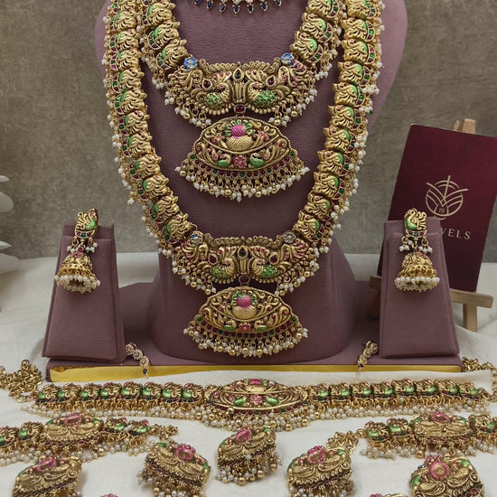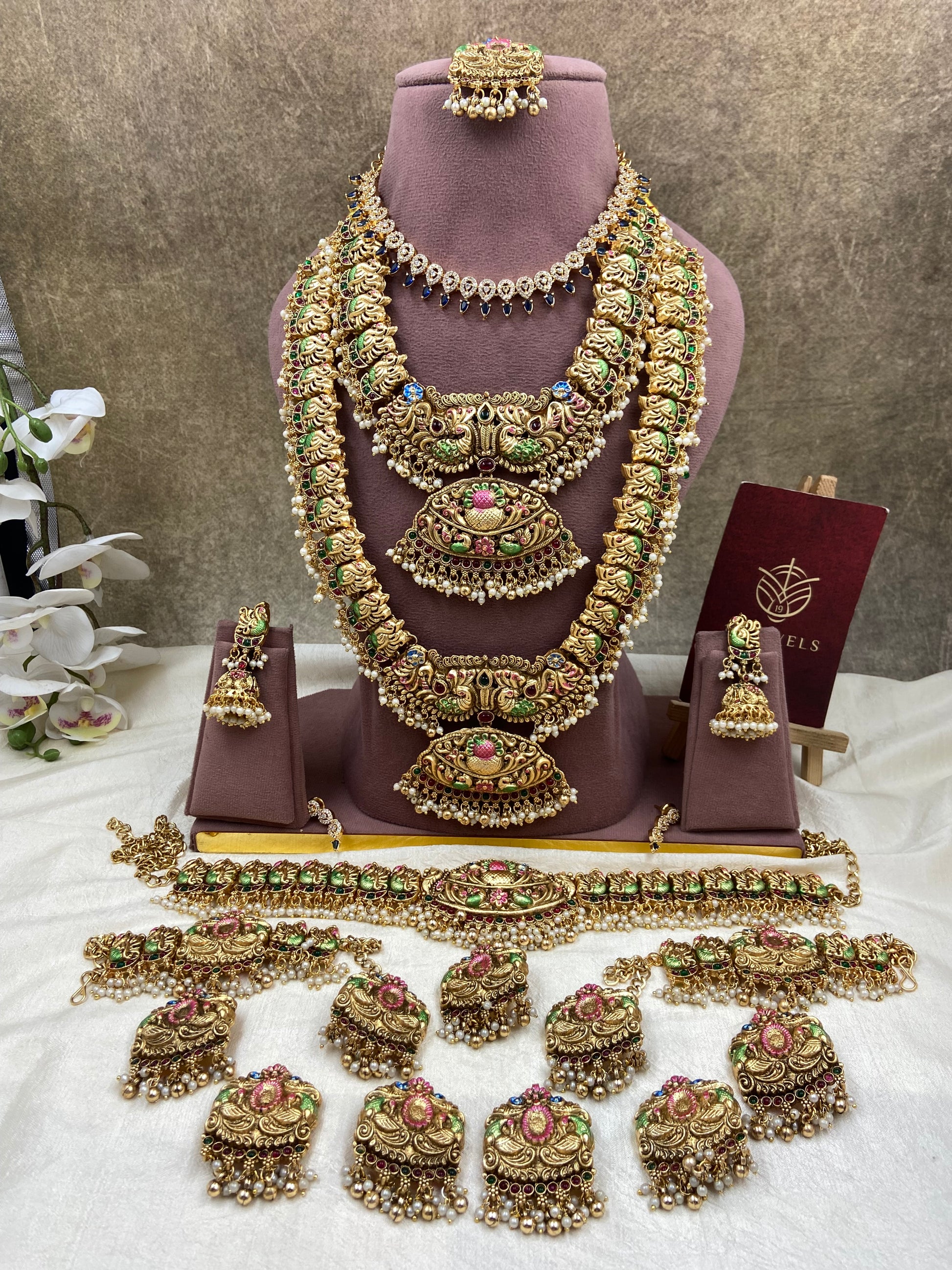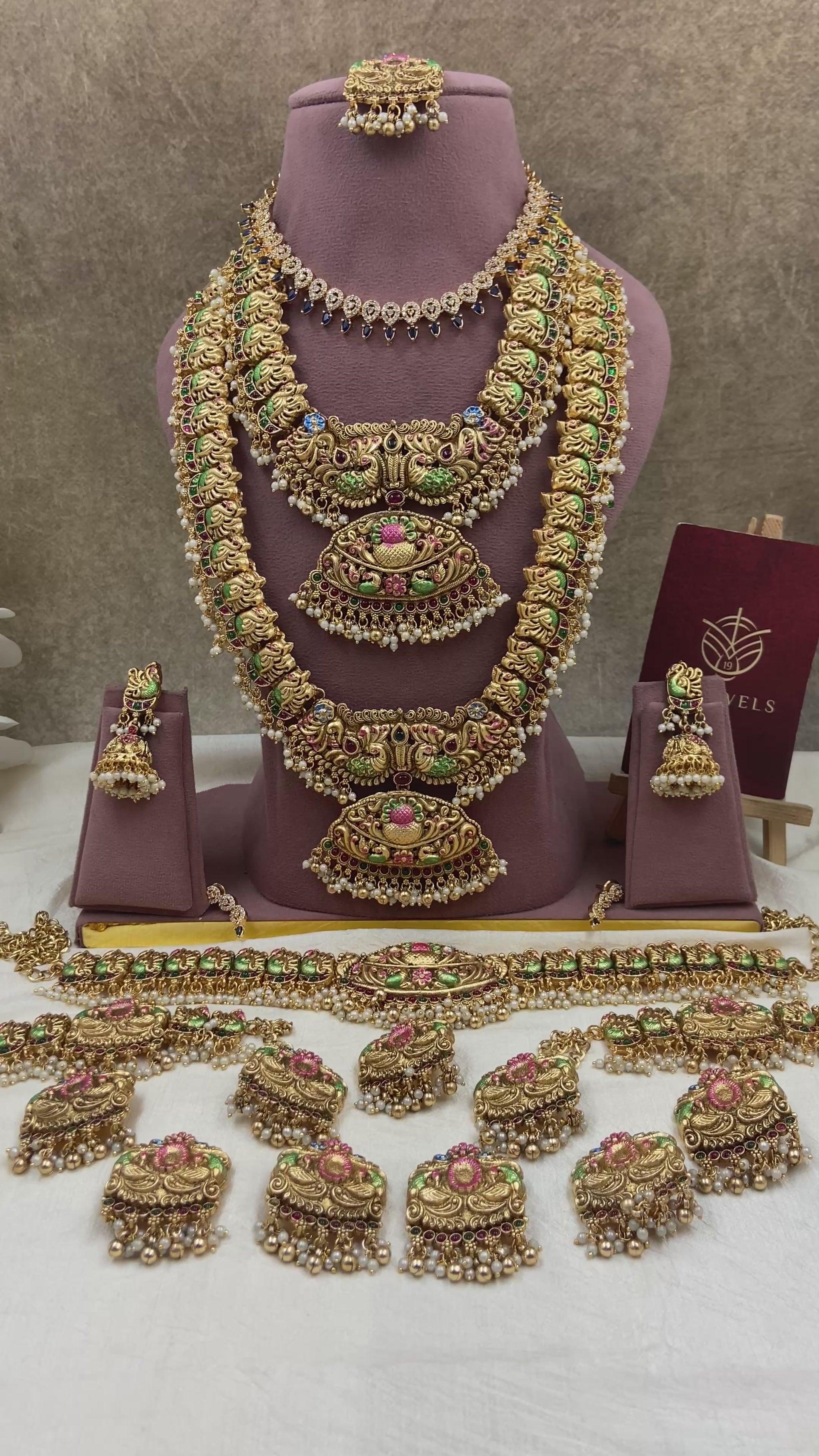 This full bridal jewellery set, offers a stunning selection of non-idol pieces that are perfect for your special day. Crafted with precision and elegance, these pieces are the perfect complement to any bridal outfit. Complete your look with this beautiful and unique set.