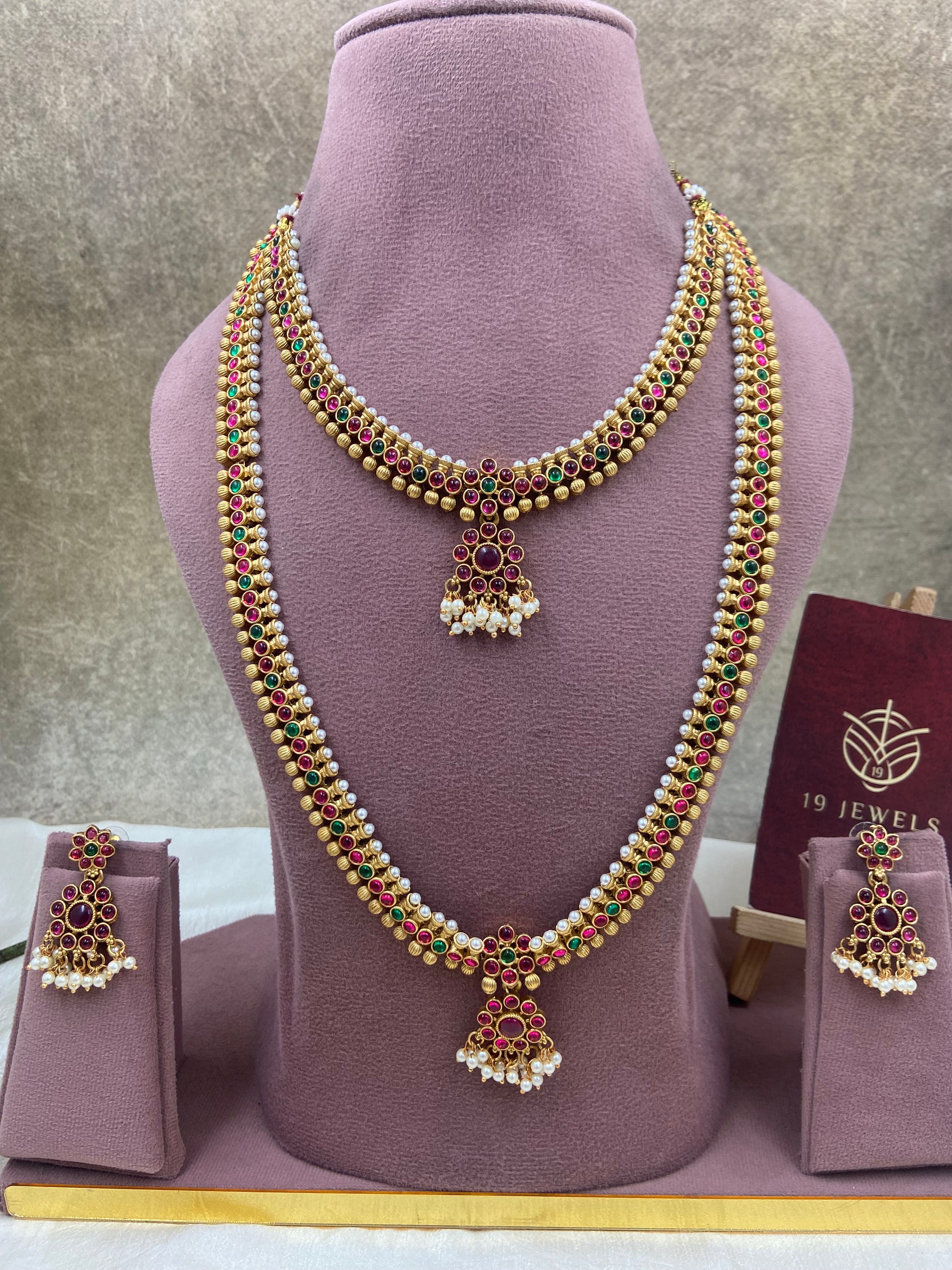 This traditional kempu type combo features a stunning combo haram jewellery design. Made with precision and care, this piece will add a touch of elegance and charm to any outfit. With its eye-catching design, it is sure to make a statement and elevate your style.