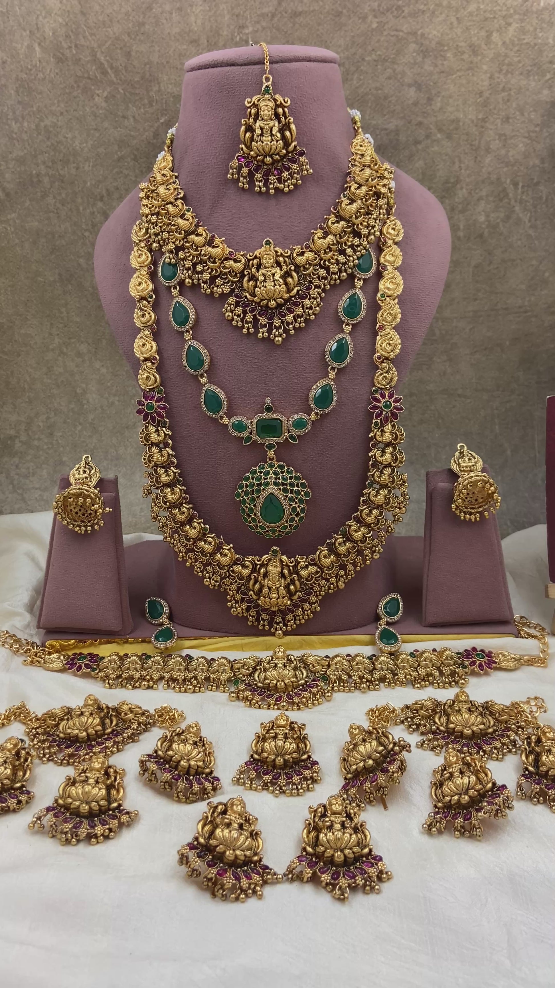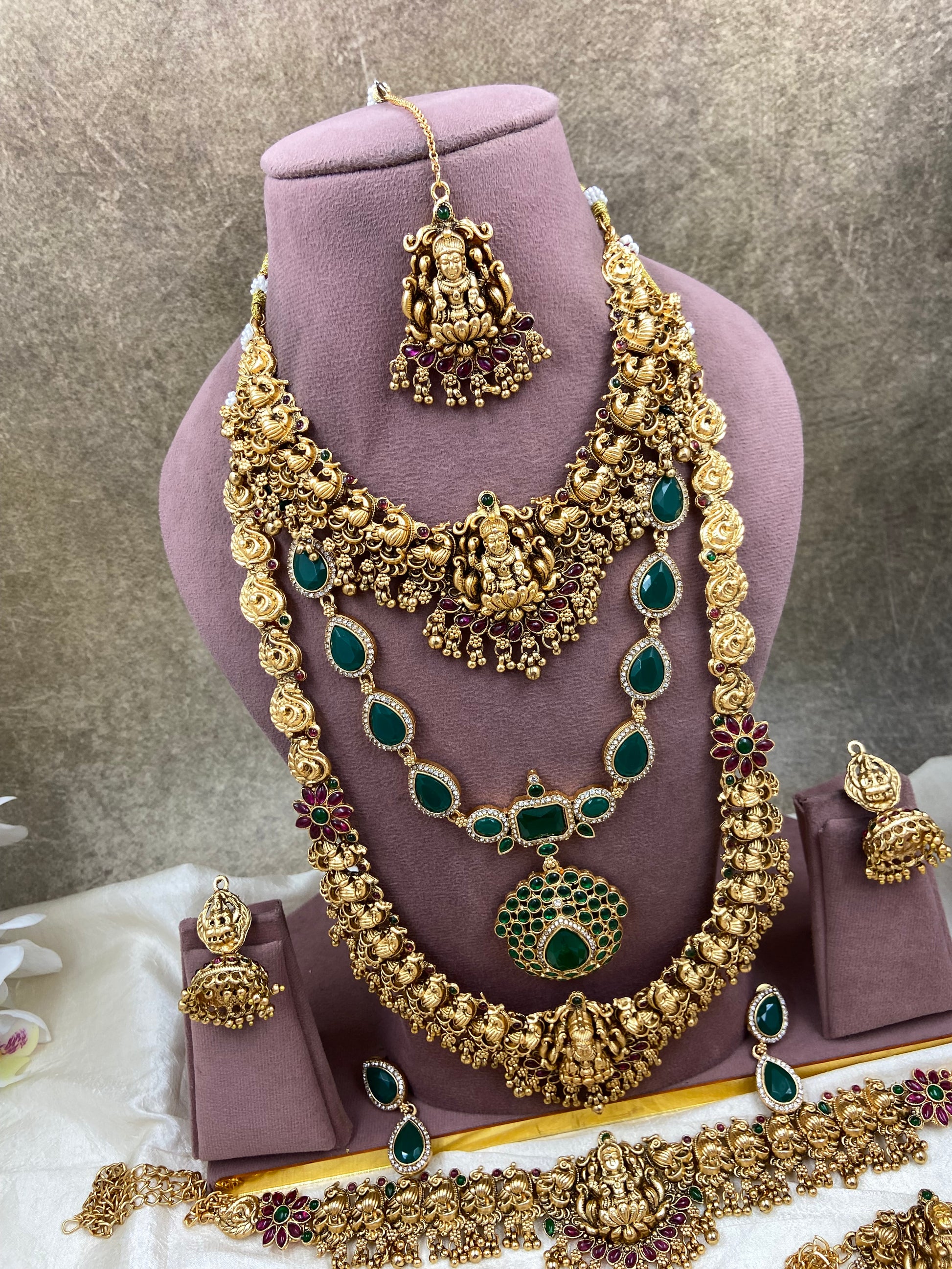 Indulge in elegance with our Full bridal jewellery featuring a complete set of stunning and carefully crafted pieces. The intricate designs showcase expert craftsmanship and add the perfect touch of glamour to any bridal look. Treat yourself to the luxury and radiance of this beautiful set.